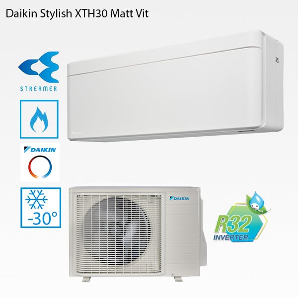 Daikin Stylish XTH30 Vit med Nepura+ utomhusdel är designmodellen med sober vit frontpanel och matt finish. Kompakt och funktionell design som är lämplig för alla utrymmen där man ställer krav på inredningsdetaljer.