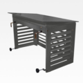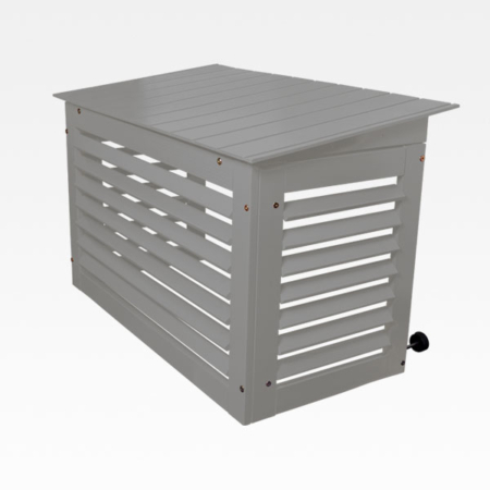 Grått lackat värmepumpsskydd, välbyggt lackerat i blygrått.