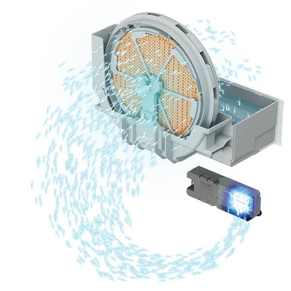 Luften som kommer in i enheten går igenom flera rensningssteg där den fuktas och mättas med användbara joner: